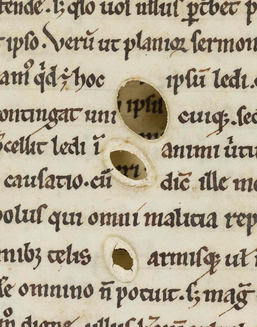 The holes made by scribes when they worked on a book’s layout are usually a great deal smaller than the holes that developed when the piece of parchment itself was made. These holes (or prickings, as they are usually called in medieval manuscripts) can often be found on the untrimmed outer margins of leaves, where they marked the spacing of the lines, and they can occur in a regular or irregular vertical pattern. The holes were usually produced with the point of a knife or of another sharp object, such as an awl, and a number of leaves might be pricked simultaneously. In some cases, it can be deduced that a wheeled tool with points was used, by looking at the slightly irregular, but consistent, marks left by the wheel, as it was rolled down the sides of the leaves to make the small holes that would guide the spacing.