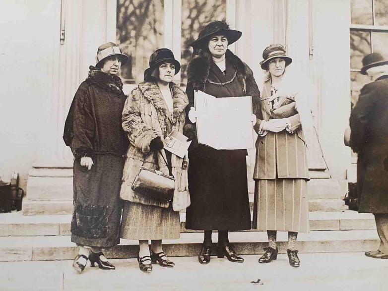 Presentation of the Welsh Women's Peace Petition Memorial at the White House in Washington, February 21, 1924, by Welsh League of Nations Union (WLNU) and American women's peace representatives. L-R: Mrs Ruth Morgan, President of the American League of Women Voters; Elined Prys (later Elined Prys Kotchnig) from Talgarth, Radnorshire; WLNU / World Student Christian Movement; Annie-Jane Hughes Griffiths from Llangeitho, Carmarthenshire; Chair of the WLNU movement; Mary Ellis (later Mary Gwilym Davies) from Dolgellau, Gwynedd; WLNU / Inspector of Schools in Wales.