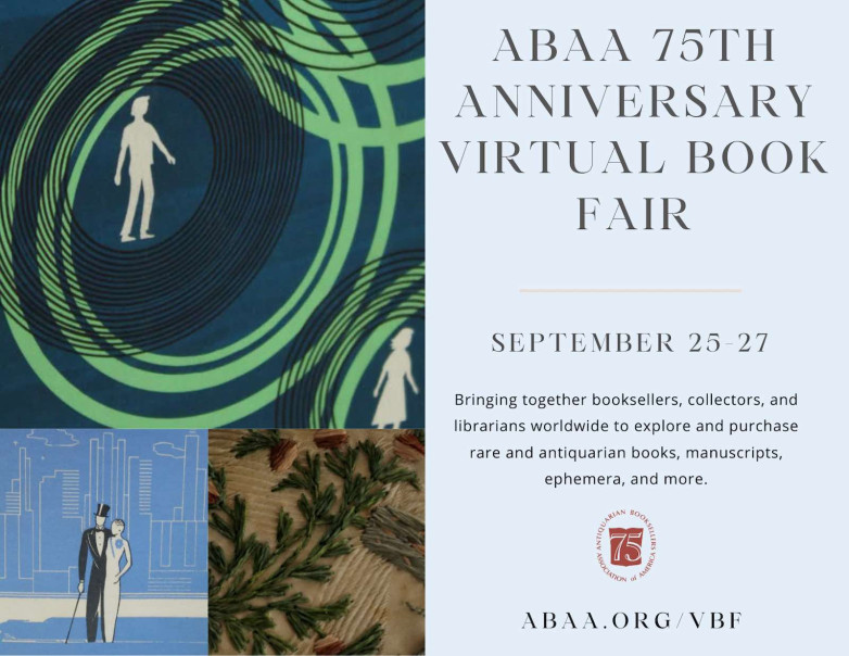 The Antiquarian Booksellers' Association of America (ABAA) will hold a Virtual Book Fair on September 25-27, with Fine Books & Collections as one of its Cultural Partners.