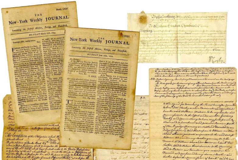 Archive of handwritten documents and printed journals relating to John Peter Zenger, the German printer accused of seditious libel in 1734. Estimate: $10,000-12,000