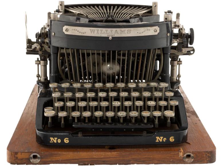 Toward the end of his life, Twain (real name Samuel Clemens) purchased this beautiful and impeccably provenanced Williams No. 6 "grasshopper" typewriter which he owned from 1908 until his death in 1910. The company produced it from 1904 to 1909, but the serial number on this example dates its manufacture to 1908. The Twains moved to Stormfield, his beloved mansion in Redding, Connecticut, in the spring of that year. This model also marked a significant improvement from the earliest machines, because its design allowed the typist to view text as it was written thanks to the "grasshopper" mechanism that pushed the typebar up as the key was struck.