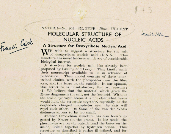CRICK, Francis H.C. (1916-2004) and WATSON, James D. (b.1928). Galley proof signed ("Francis Crick" and "James D. Watson") with two annotations. "Molecular structure of nucleic acids: A structure for deoxyribose nucleic acid." Nature 171 (1953): 737-738. Estimate: $180,000-220,000