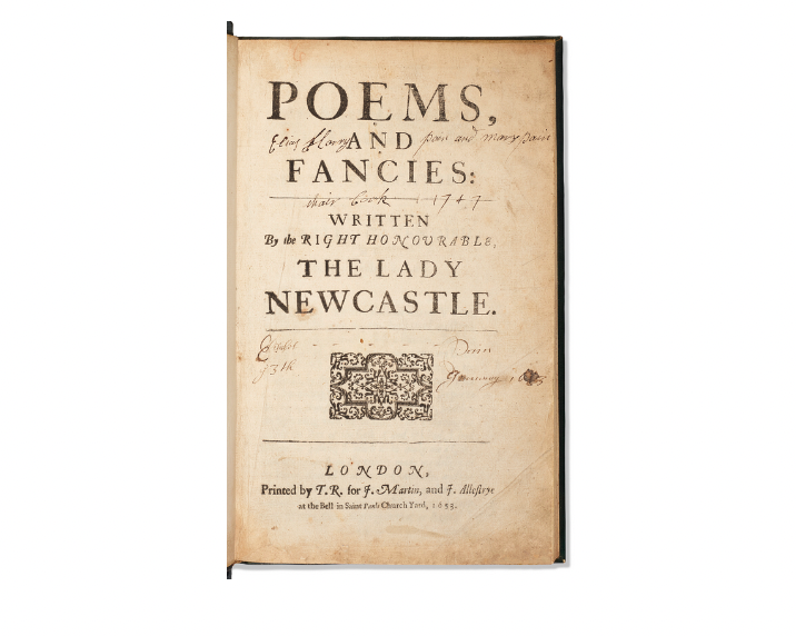 Margaret Cavendish's Poems and Fancies (1653), with an early woman's ownership inscription, offered at Christie's this week.