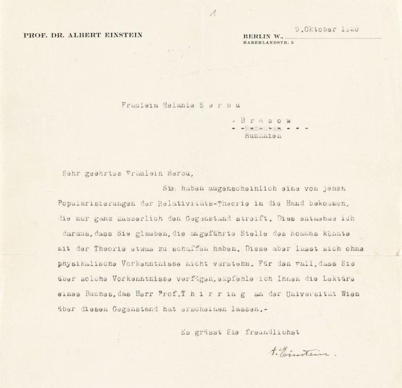 Albert Einstein, typed letter signed, to Melanie Serbu. 9 October 1928.