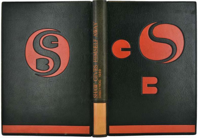 * Shaw Gives Himself Away, an Autobiographical Miscellany, by George Bernard Shaw, Newtown, Powys: Gregynog Press, 1939. First edition, from an edition of 300 copies, printed on Arnold green-tinted handmade paper, wood engraved portrait frontispiece of Shaw by John Farleigh, original binding by Paul Nash, darkest green oasis morocco with abstract designs based upon GBS’s initials. The book contains a number of extracts and other short pieces, nearly all of which have some degree of revision by Shaw, for this edition.