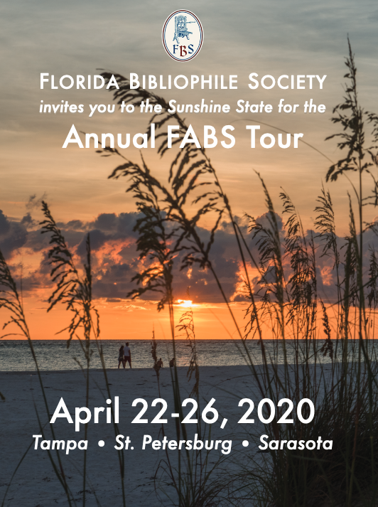 Florida — The FABS Study Tour of the Tampa Bay area April 22-26, 2020 is now open to all booklovers to sign up and enjoy. Tour participants will be given free one-year membership in the Florida Bibliophile Society. Membership in a FABS sister club is not required.