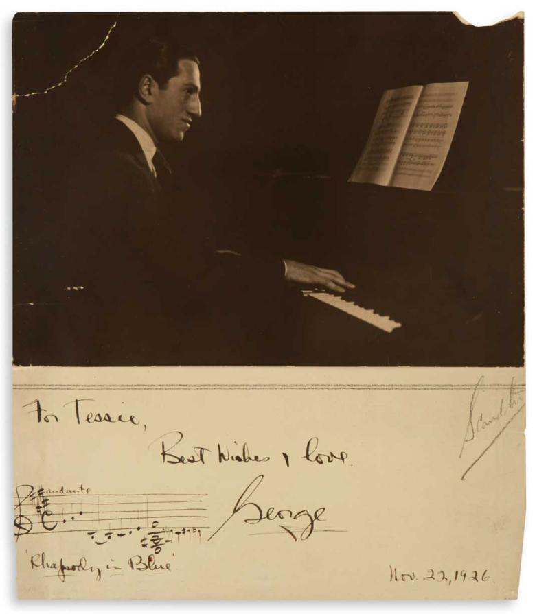George Gershwin, signed photograph with autograph musical quotation from Rhapsody in Blue. Estimate: $4,000 to $6,000.