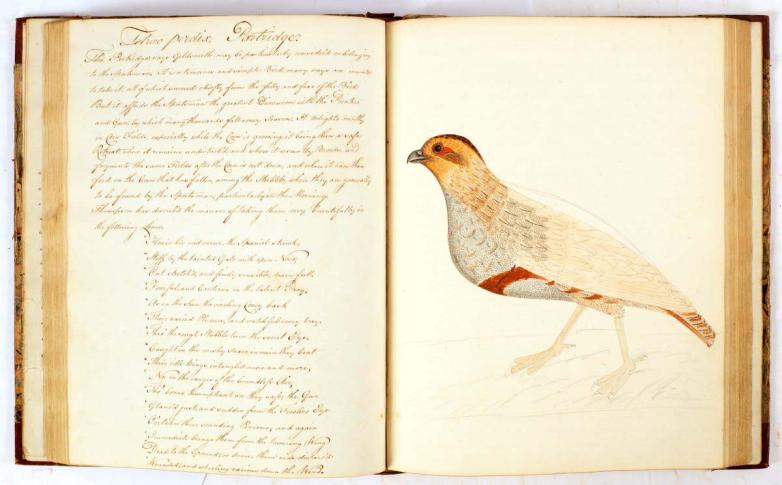 Description and illustration of a partridge by Francis Justice, from two volumes of manuscript ornithological writing and artwork offered at Chorley's this week.