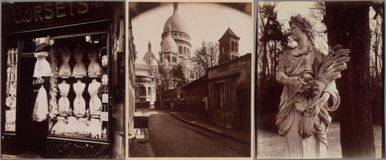 Left to right: Boulevard de Strasbourg (Corsets), 1912, Eugene Atget. Gelatin silver chloride. Montmartre - Rue du Chevalier de la Barre, 1923, Eugene Atget. Gelatin silver chloride. Versailles, 1922, Eugene Atget. Albumen silver print.