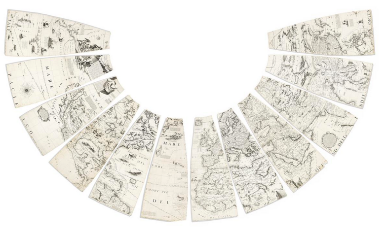 A set of 24 engraved gores for Vincenzo Coronelli's 42-inch globe (Venice, between 1688 and 1697), offered at Swann Galleries this week.