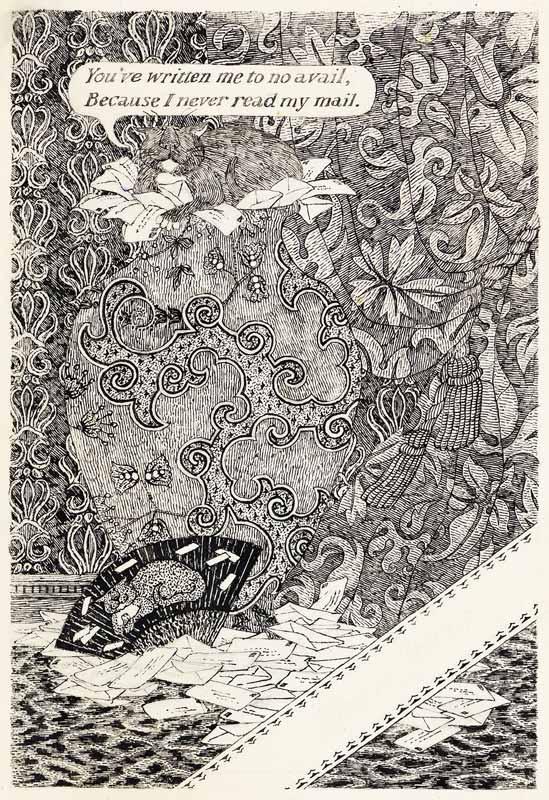 From Edward Gorey's You’ve written me to no avail, Because I never read my mail, postcard design created by Gorey for the purpose of replying to fan mail, pen and ink, 1979. Estimate: $4,000-6,000