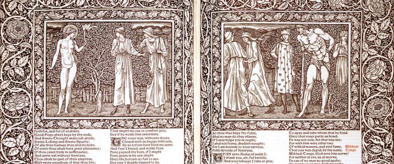 For its part, the University of Delaware Library, Museums and Press presents A Book with a Claim to Beauty: Marking the 125th Anniversary of William Morris’s Kelmsoctt Chaucer, an online exhibition that highlights two copies of the Kelmscott Chaucer alongside other notable items associated with the Kelmscott Press.