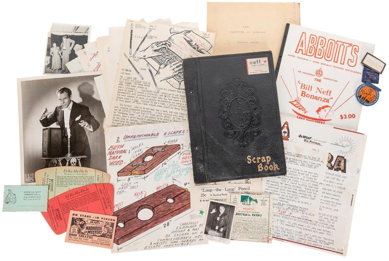 •    Lot #198, an archive of Bill Neff personal and Ghost Show ephemera, is estimated at $500-1,000. The materials date from the c. 1930– 60 time frame. They include Neff's scrapbook detailing ideas for “exploiting” his magic show, his badge for the 6th Annual I.B.M. convention, an early throw-out card, handwritten cue sheets, various advertising novelties, letters from Neff to Jack and Leola LaWain, who would sell the Neff show after his passing, typed documents illustrated by Neff to help advertise various magic effects and outline the working of others, photographs, and more.