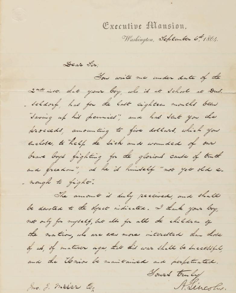 A momentous letter from Abraham Lincoln thanking a schoolboy, from the collection of Elsie and Philip Sang. Estimate: $700,000-1,000,000