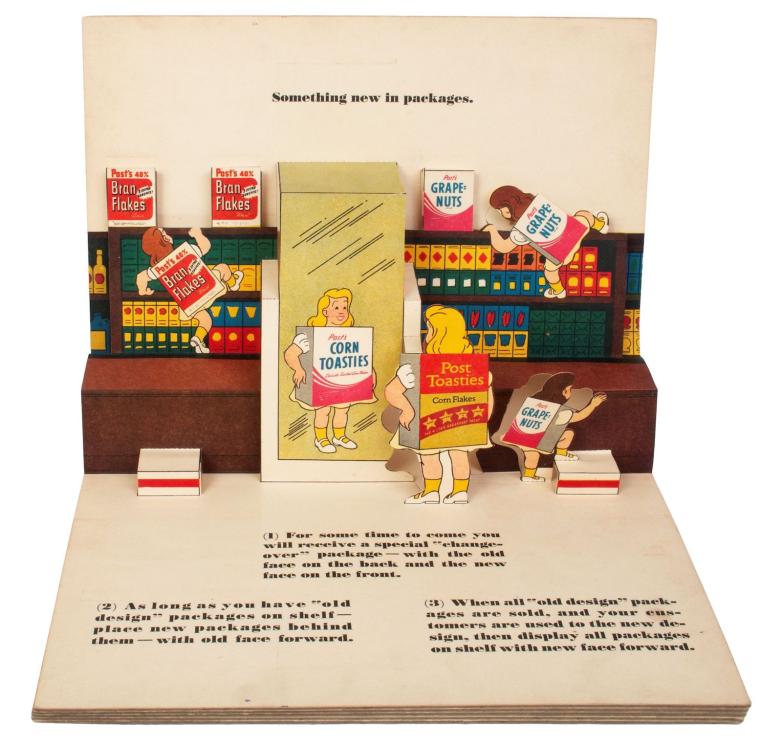The exhibition traces how advertising advanced with dramatic progressions in printing and manufacturing technologies. All objects on view in the exhibition are embellished with interactive paper features—such as pop-ups, pull-tabs, and moving pieces—and comprise games, trading cards, and collectible sets.
