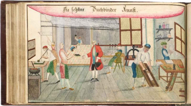 Illustration of a bindery from Denckmal der Freundschafft von Gottlob Ehrenfried Knothe, 1778, offered by Bernard Quaritch.