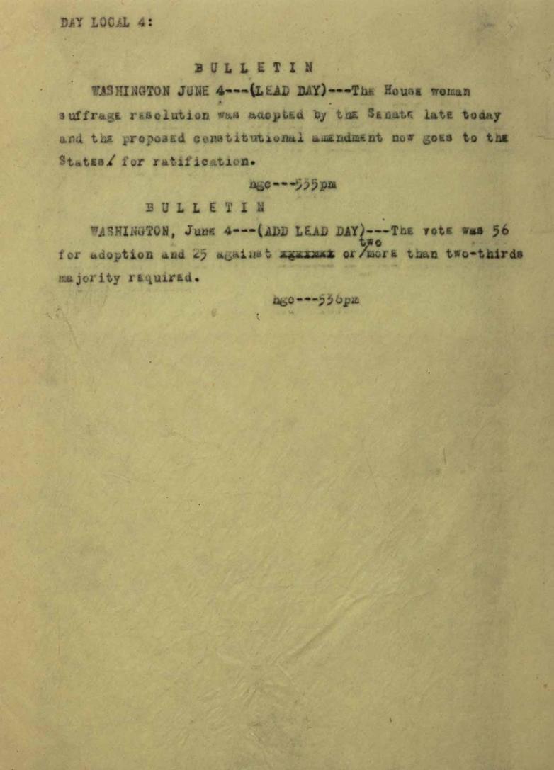 •    News that the Senate voted 56-25 on June 4, 1919, approving a resolution for women’s suffrage and sending the constitutional amendment to the states for ratification;