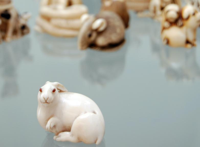 Various netsuke from the de Waal Family Collection. In the foreground: Recumbent hare with raised forepaw, signed Masatoshi ivory, eyes inlaid in amber colored buffalo horn. Osaka, Japan, ca. 1880.