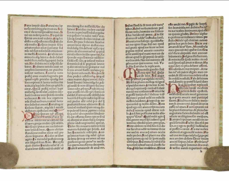 Written around 1444 by Aeneas Sylvius Piccolomini who became the future Pope Pius II in 1458, De Duobus amantibus Euryalo et Lucretia (Venice, Petrus de Quarengiis, March, 1497, estimate: $800–$8,000) known as Tale of the Two Lovers was one of the earliest epistolary novels and first printed in Cologne between 1467 and 1470. On becoming Pope he tried to hide elements of his previous life, including the writing of this novel which is set in Siena, Italy, and full of erotic imagery, focusing on the love story of the married Lucretia and Euryalus who is part of the Duke of Austria's court.