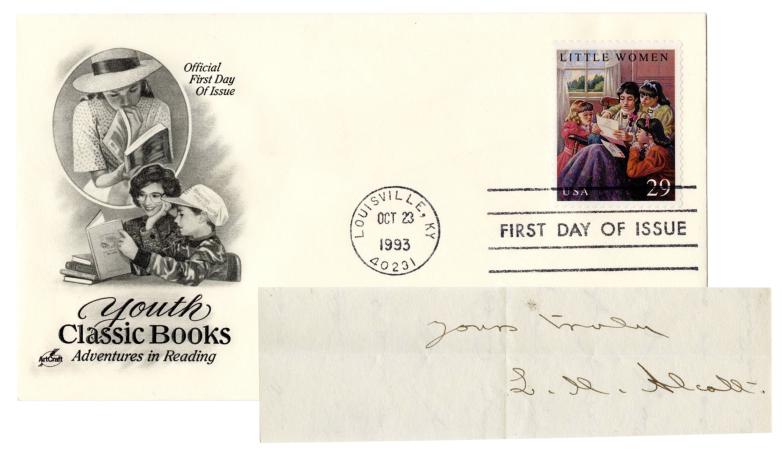 •    Lot #853, Louisa May Alcott's signature clipped from a letter is estimated at $100-200. It is signed, Yours truly/L.M. Alcott and has 10 broken lines of writing in her hand on the reverse.