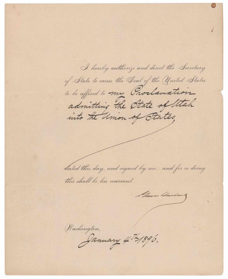 Dated January 4, 1896, the one-page document features President Cleveland's directive to the Secretary of State to affix the Seal of the United States to his Proclamation admitting the State of Utah into the Union of States.