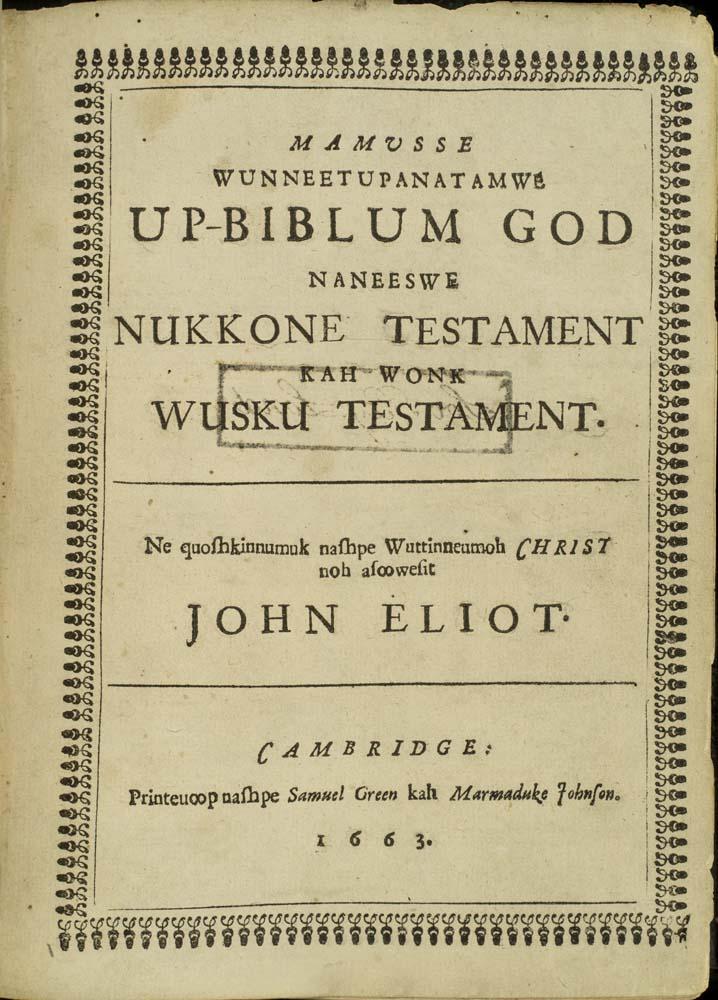 2a Eliot IL2018_107_2_title.jpgThe first Bible printed in America: John Eliot's "Indian Bible," Mamusse Wunneetupanatamwe Up-Biblum God. Cambridge, 1663 & 1661. David M. Rubenstein Americana Collection.