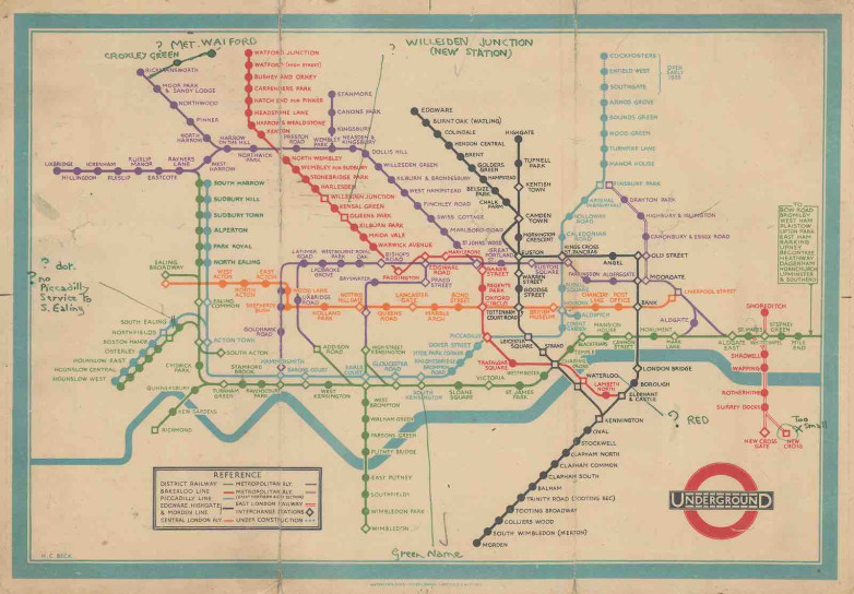 Unpublished annotated Proof of Harry Beck’s 1933 first edition tube map, with corrections and proposals in Becks own hand