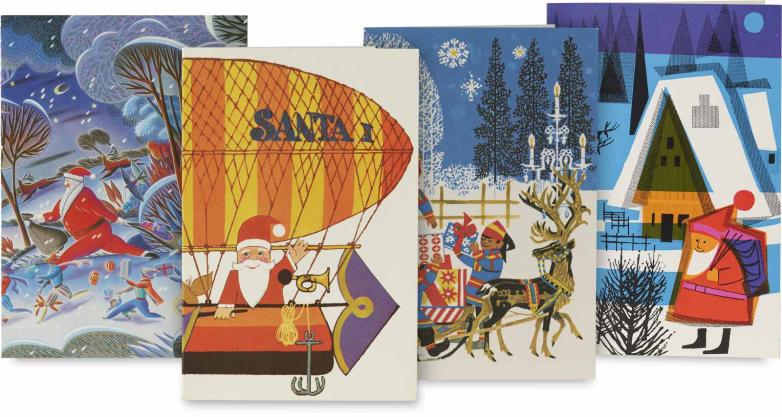 On exhibit at London’s Postal Museum are vintage Santa cards, sent to children by the post office, beginning in 1963. Annual cards pictured left to right: 1989, 1969, 1968, and 1963.
