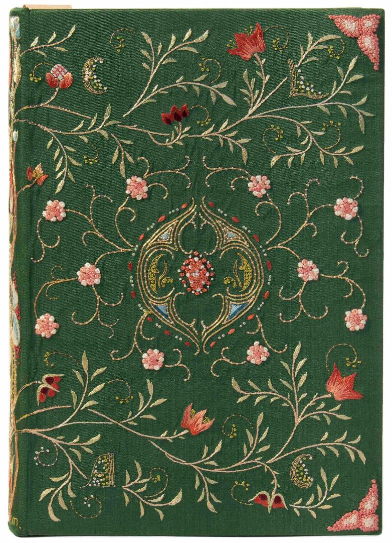 * May Morris, daughter of William Morris and director of embroidery at Morris & Co., created the ca. 1888 floral embroidered binding for the publication Embroidery and Lace: Their Manufacture and History from the Remotest Antiquity to the Present Day by Ernest Lefébure. Featuring bright green ribbed silk and pink flowers, with a central arabesque on the cover, Morris signed the spine “.m.” at the bottom right corner.