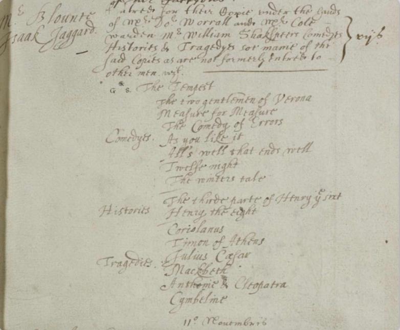 Detail from the Register of entries for November 8, 1623, when Edward Blount and Isaac Jaggard entered Mr. William Shakspeers Comedyes, Histories & Tragedyes in the Stationers’ Register