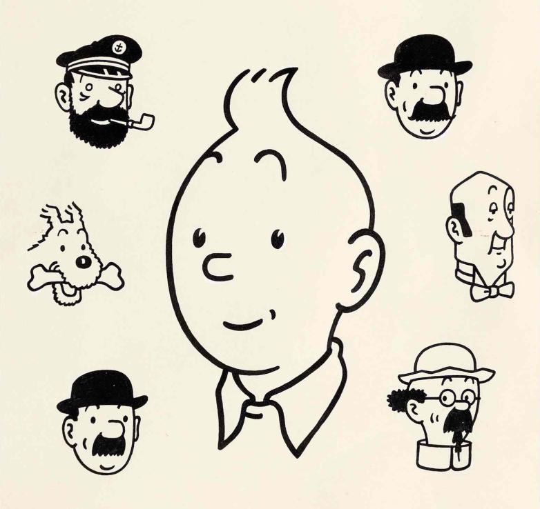 In the second work Tintin is surrounded by the series' six most important characters, among then Snowy and Haddock. But it didn't only serve as the cover for 1963's Album à colorier No. 6: This illustration was also used as the front of the commercial brochure used when Little, Brown and Company brought Tintin to U.S. shores in 1974. For many Americans, this image was their introduction to him.