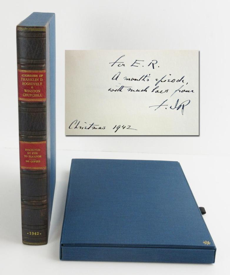 Presentation copy of Addresses of Franklin D. Roosevelt and Winston Churchill, a war dated book from 1942, signed and inscribed by FDR to Eleanor Roosevelt. Estimate: $20,000-24,000