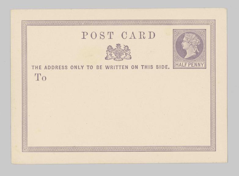 •    the first British postcard from 1870, a pre-paid postcard template with a blank front