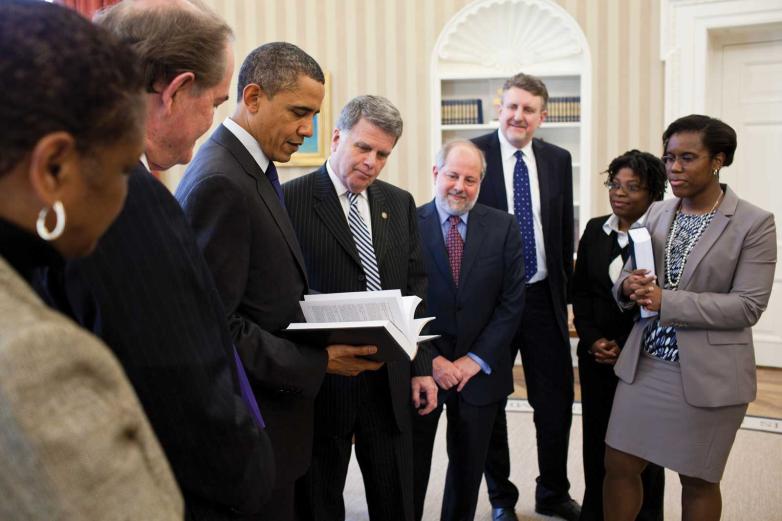 President Barack Obama receives a leather-bound 2009 edition of the Public Papers of the Presidents of the United States from Archivist of the United States David S. Ferriero, in the Oval Office, February 25, 2011.