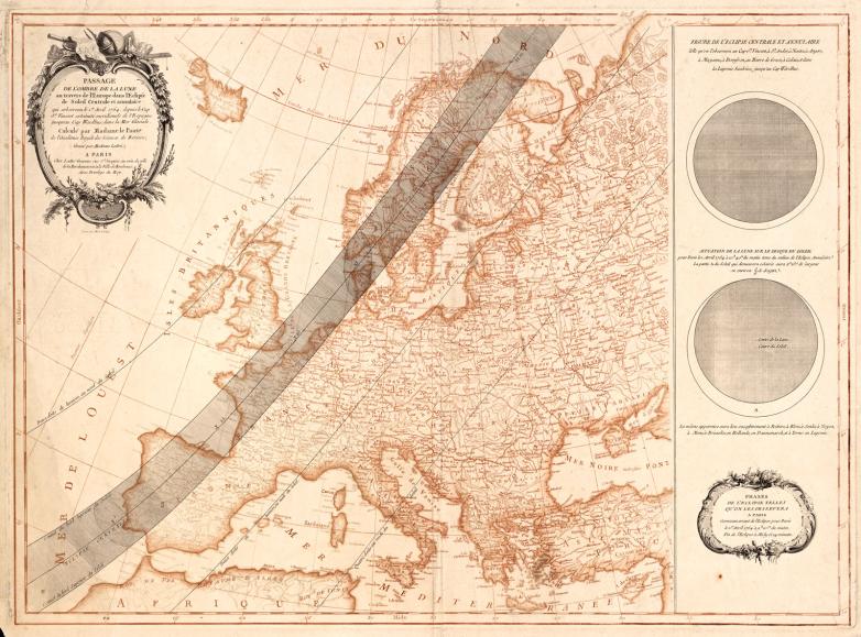 Madame Le Pauté Dagelet’s map predicting the path of the eclipse of April 1, 1764 was prepared from two separately engraved copperplates: one for the sepia-toned background geography and a separate black plate which highlighted the path of the moon’s shadow, the cartouche, and a side panel. The map was engraved by Madame Lattré and Elisabeth Claire Tardieu.