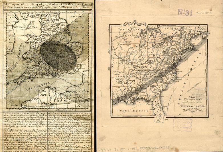 Left: Edmond Halley’s map of the solar eclipse of April 22, 1715 (May 3rd according to the Gregorian calendar adopted by Britain in 1752), was published shortly after the event. It updated the broadside published a few months earlier by showing the path of the moon’s oval-shaped shadow (or umbra) as it actually passed over London. Right: The earliest American-made solar eclipse map was published by The American Almanac and Repository to publicize the upcoming event of February 12, 1831. The map incorporated a prime meridian based at Washington, D.C. The borders of the Gulf Stream off the coast of Florida were also marked. ​​​​​​​