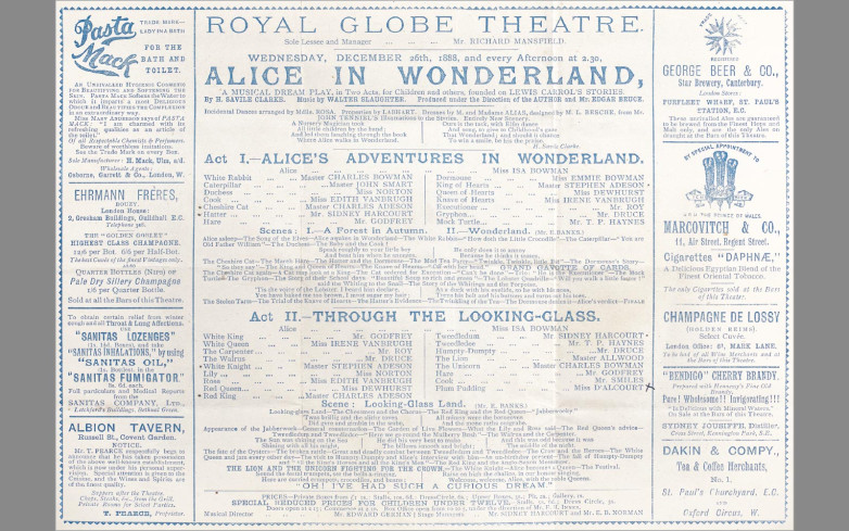 A December 1888 program for the musical Alice in Wonderland at the Royal Globe Theatre.