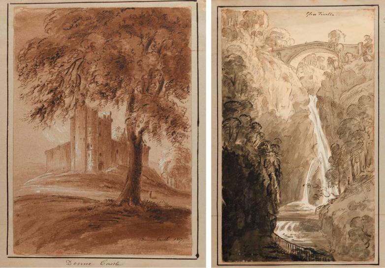 Skene’s sketchbook contains drawings of (left) Doune Castle, which features in Scott’s novel, Waverley (1814) and (right) Den of Finella, a waterfall named for a woman believed to have murdered a Scottish king and then leapt to her death.