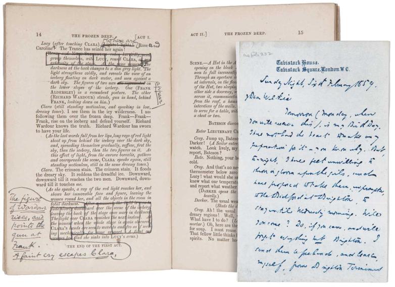 Left: A copy of The Frozen Deep (1866), a play written collaboratively by Charles Dickens and Wilkie Collins, annotated by Collins. Right: A February 6, 1859, letter from Dickens to Collins.