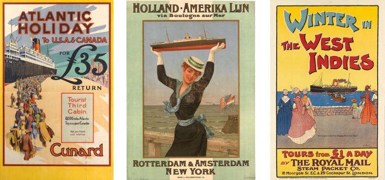 Left to Right: At a December 2014 sale of travel posters from the Julius Paul Collection at Swann Galleries, “Winter in the West Indies” (1904) by A. S. Forrest realized $1,063.  The top lot of that sale was this poster for “Holland-Amerika Lijn” (1898) by Jan Van Beers. It reached $7,500. At the same sale, “Atlantic Holiday to U.S.A. & Canada” by an unknown designer for Cunard, c. 1939, made $1,500.
