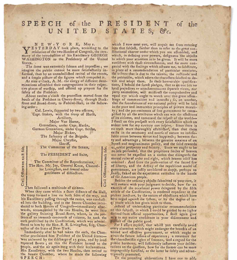 Broadside of George Washington’s First Inaugural Address Tops Americana Auction