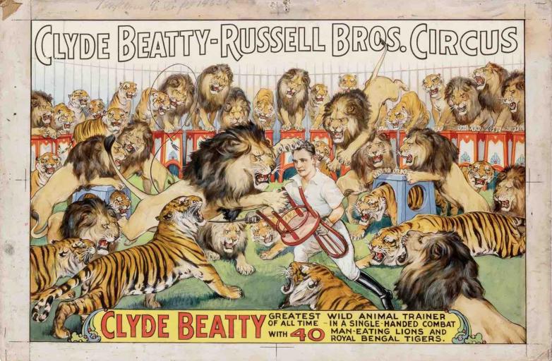 - Clyde Beatty - Russell Bros. Circus / Clyde Beatty Greatest Wild Animal Trainer of All Time - in a Single-Handed Combat with 40 Man-Eating Lions and Royal Bengal Tigers which was estimated at $500-700 and sold for $3,360. It was printed around 1920-1930. This gouache on board example depicted Clyde Beatty taming animals