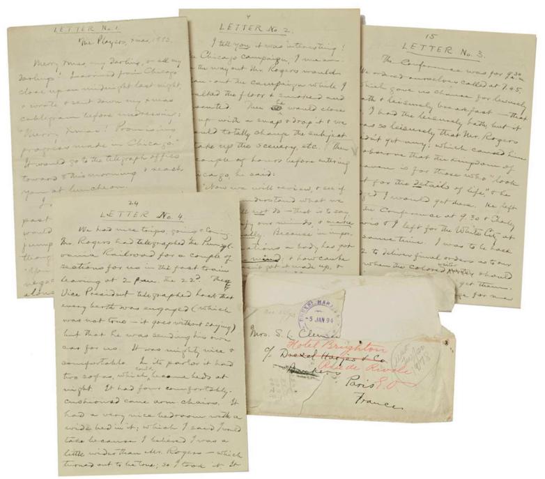 Mark Twain appears in lot 208 through a 26 page autograph letter signed by Samuel Clemens, dated December 1893. The letter paints a loving, intimate portrait of Clemens’ relationship with his wife Livy and their three daughters Susy, Clara, and Jean. Other important literary and business topics range from Twain’s request of Bram Stoker of a Henry Irving photograph for Livy, and more worrying details about Twain’s heavy investment in Paige’s typesetting machine which would soon lead to his bankruptcy.