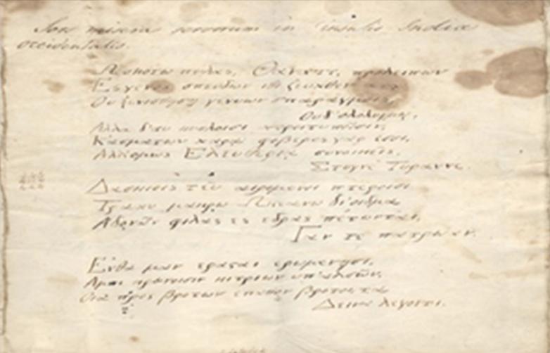 Coleridge (1772-1834), one of the leading figures of the Romantic movement in England, wrote the Greek verses while he was studying at the University of Cambridge and they are the only known draft of the work. He wrote the poem 15 years before the slave trade was abolished by Parliament.