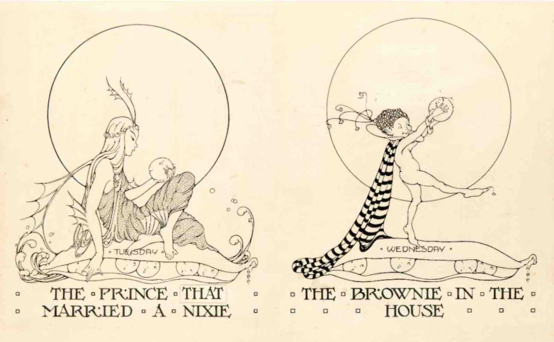 Alice Bolam Preston (1889-1958), The Prince That Married a Nixie and The Brownie in the House. Seven Peas in the Pod by Margery Bailey, 1919. Pen and ink on board.