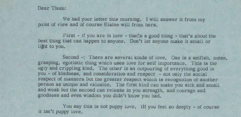The remarkable two-page draft letter to his 14-year-old son, Thomas, is dated November 10, 1958. In it, Steinbeck's sage advice to his love-torn son, in part: "if you are in love—that's a good thing—that's about the best thing that can happen to anyone. Don't let anyone make it small or light to you."