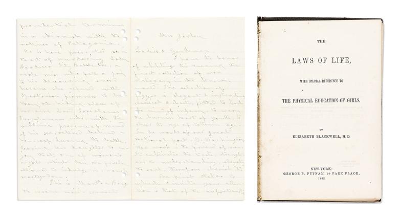 * Lot 158: Elizabeth Blackwell, The Laws of Life with Special Reference to the Physical Education of Girls, first edition, New York, 1852. Estimate $3,000 to $5,000.