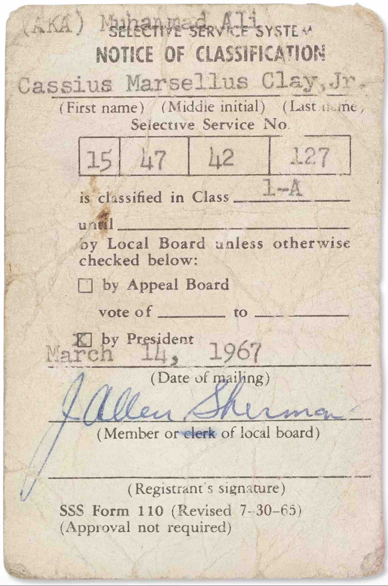 This card, which Ali would have carried with him for years as required by law, comes from his descendants and is signed by J. Allen Sherman, Chairman of the local Draft Board. It is pointedly not signed by Muhammad Ali.