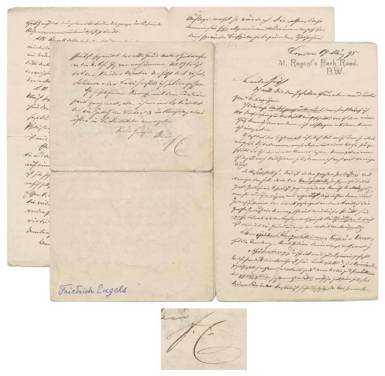 This extraordinary letter is written on Engels' personal stationery, featuring his home address at 41 Regent's Park Road in London., Engels' name is penned in ink on the bottom of the fourth page, likely by a later hand.