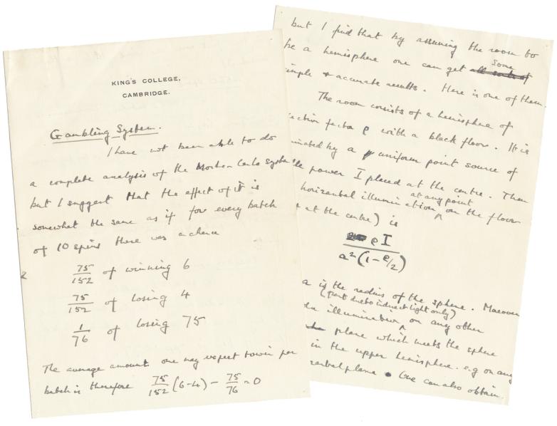 Turing is typical thorough in his analysis of the ‘Monte Carlo system’, though there is an element of tongue in cheek in his application of mathematics and equations to an essentially light-hearted subject. He concludes that the more one played, the probability of losing increased.  Or as he puts it in the letter, "...for short runs one most probably wins or else one loses an unexpectedly large sum. As the length of run is increased the chances of winning becomes more remote...". Alfred’s success it would seem owed more to luck than judgement.